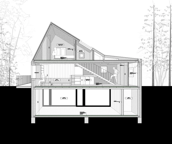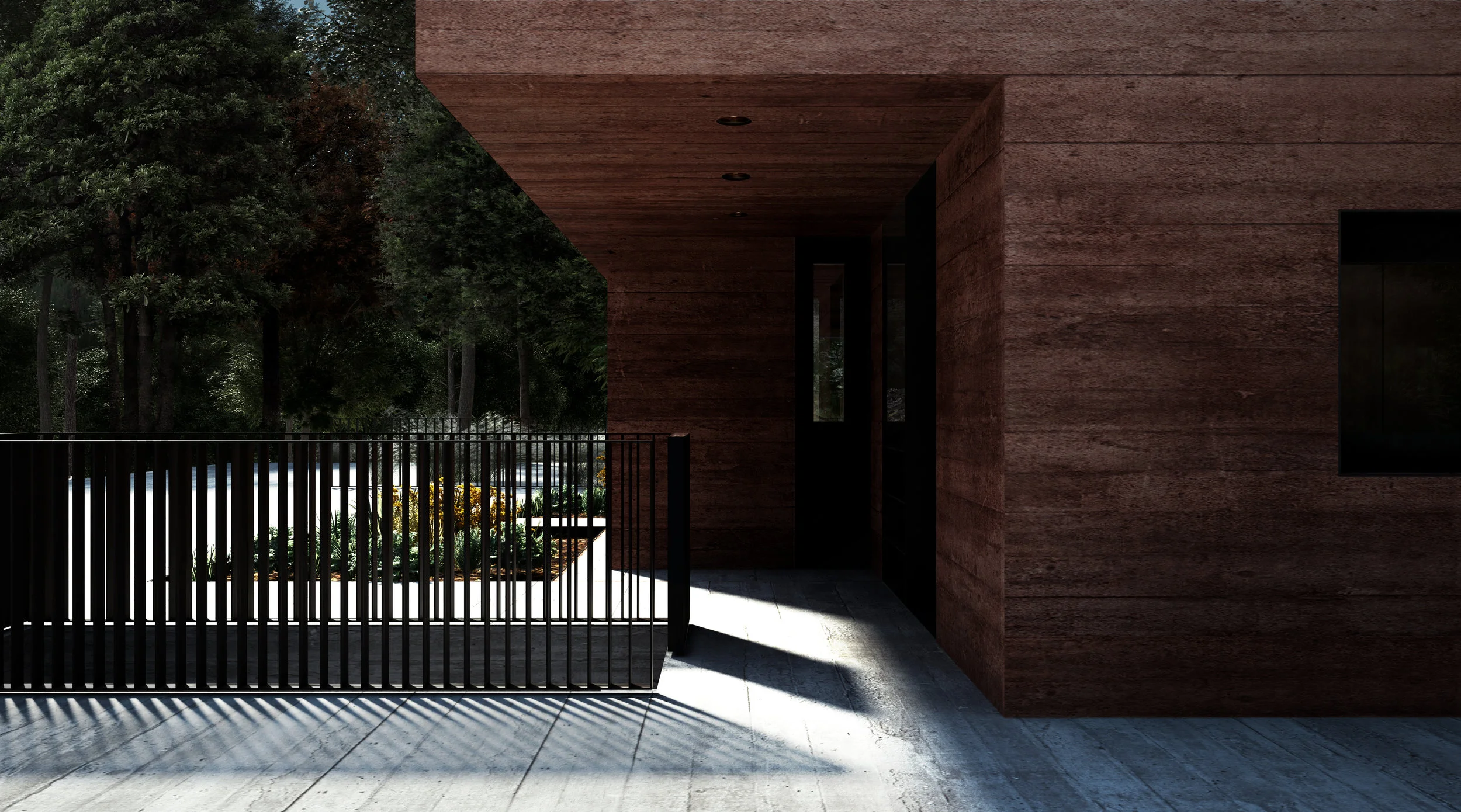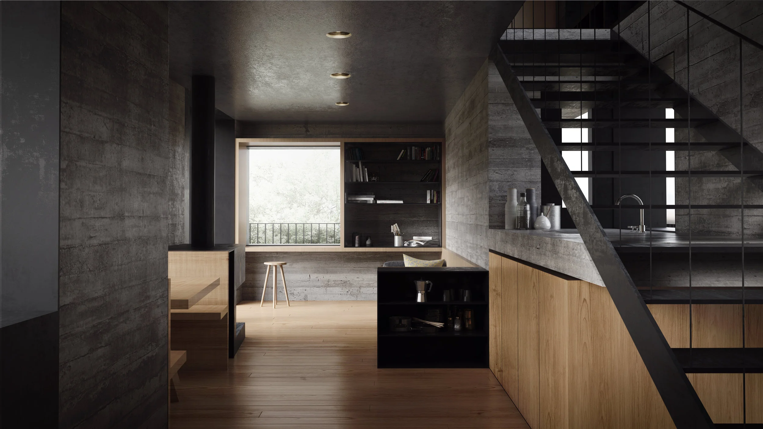 The overall concept of the house is to create a protective boundary towards the public face of the North, which also provides access to the basement, whilst the south façade provides penetrations of various sizes to allow views into garden and natural lighting into the house.