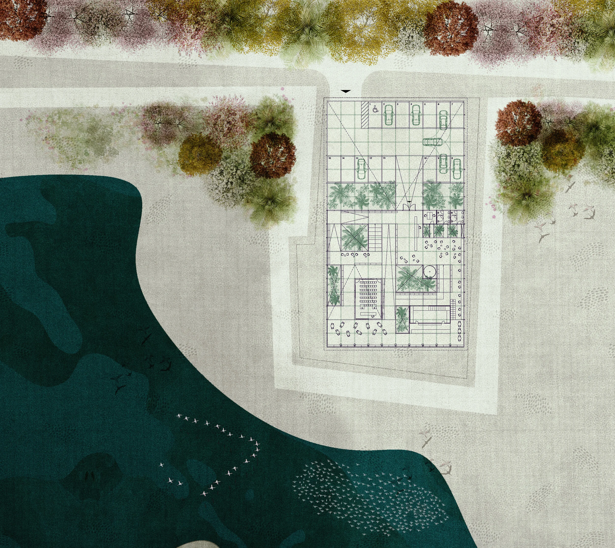The approach of the proposal originated through the understanding of the land, and its own morphology. We have been fascinated and interested by what horizontality has to offer and create. Revolving around what horizontality would have meant to us, we found ourselves dealing with a sense of calmness, acceptance, stretching horizons and continuity. While the land seamlessly houses changes in its landscape, dry and wet seems to coexist in an uninterrupted and sophisticated way. A sense of acceptance could be found, we feel it, and so the wild population that inhabit the place, generating a unique habitat worthy of being called home. Horizontality normally establishes a strong and decisive contrast between the land and the sky. This contrast generates a space where the human sight is able to catch details which are otherwise missed, often due to the blurred relationships.