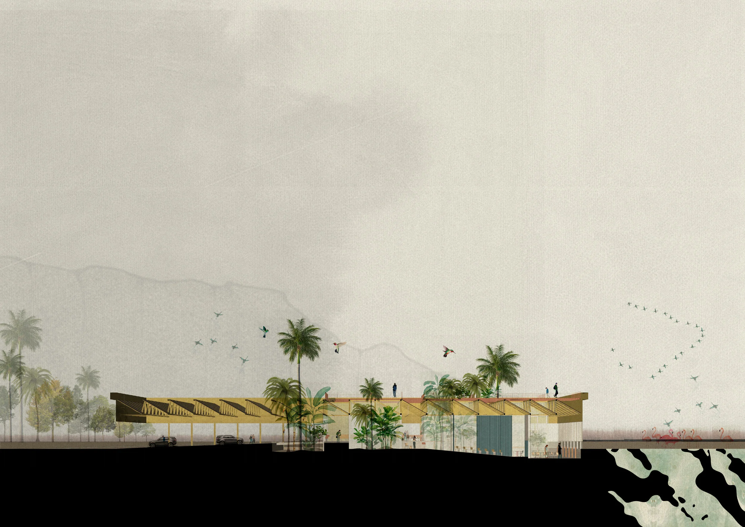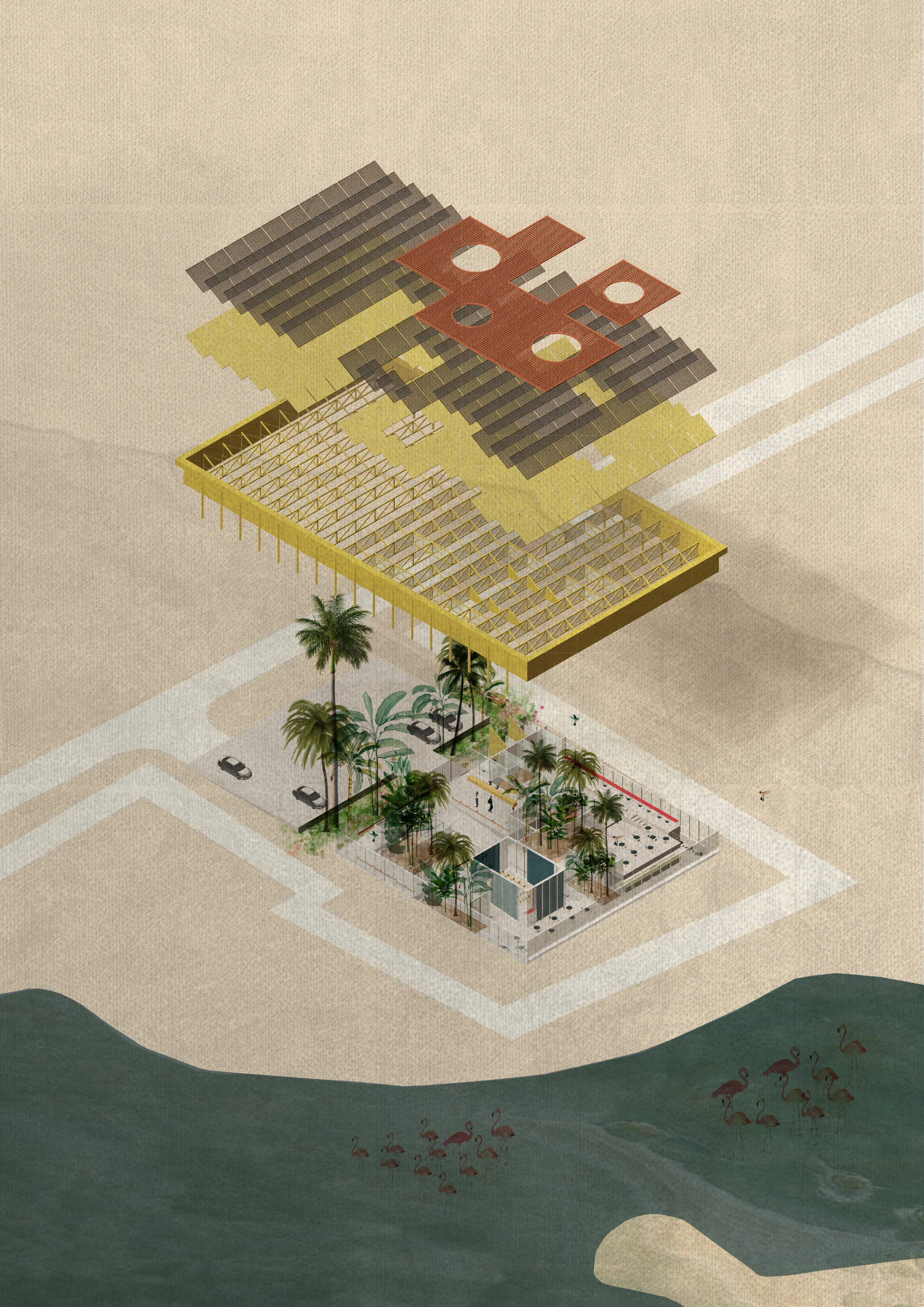 The design aims to develop an architecture that finds itself into that space, able to provide shelter to a vast array of activities with the ultimate goal of capturing those moments that the land, its population and the environment have to offer. Following the brief, a regular rhythm of UC steel beams lay on the competition site requiring minimal excavation. The punctual landing of the structure ensures a sense of lightness, almost ethereal, like a temporary structure, similar to a tent that provides a roof that can be removed and installed elsewhere. Crossing Vierendeel truss allow for a generous column free span achieving that condition of continuity / uninterrupted we described at the very beginning, which inevitably connects with the nature of the land. A continuous perimeter fascia provides rigidity and stability to the main structural system, which is easy to assemble and to maintain, while a case all around hosts all technical equipment such as HVAC unit, lighting drivers, converters, and electrical main panels. Roof panels with integrated solar system to fill up the void that the structural grid generates, their inclination ensure optimal solar exposure collecting enough electrical supply that makes the building self-sufficient. A metal grille terrace lies on top of them providing the customer with a breath-taking and unobstructed view to the whole wet land, allowing the sun rays to pass through it without compromising the solar system functionality.